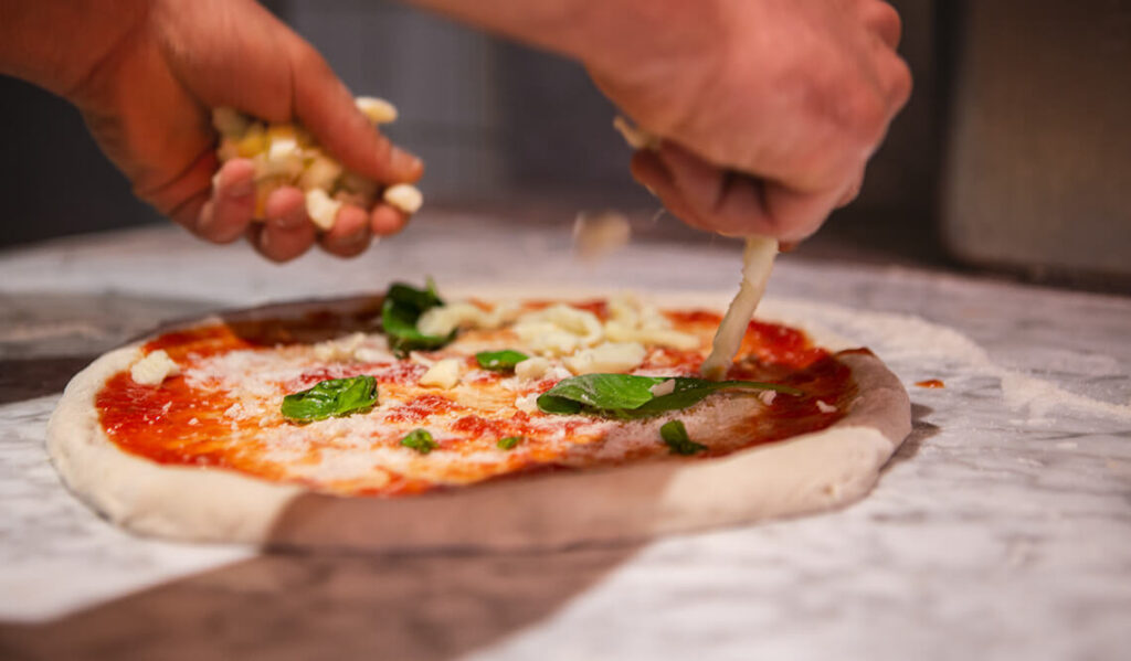 Die Zubereitung des Teiges braucht Zeit, denn sein Geheimnis liegt in der wenigen Hefe. Dazu kommt 100% reinsortiges kampanisches Weichweizenmehl. Der Teig wird mindestens 24 Stunden ruhen gelassen und wir produzieren jeden Tag frischen Teig. Durch natürliche Fermentation und einer der langen Gehzeit wird der Teig leicht verdaulich und in seiner Beschaffenheit und Textur unverwechselbar. Beim Backen muss ein großer Rand mit schön gebräunten Blasen im Teig entstehen – zur Mitte hin wird der Teig dann immer dünner!